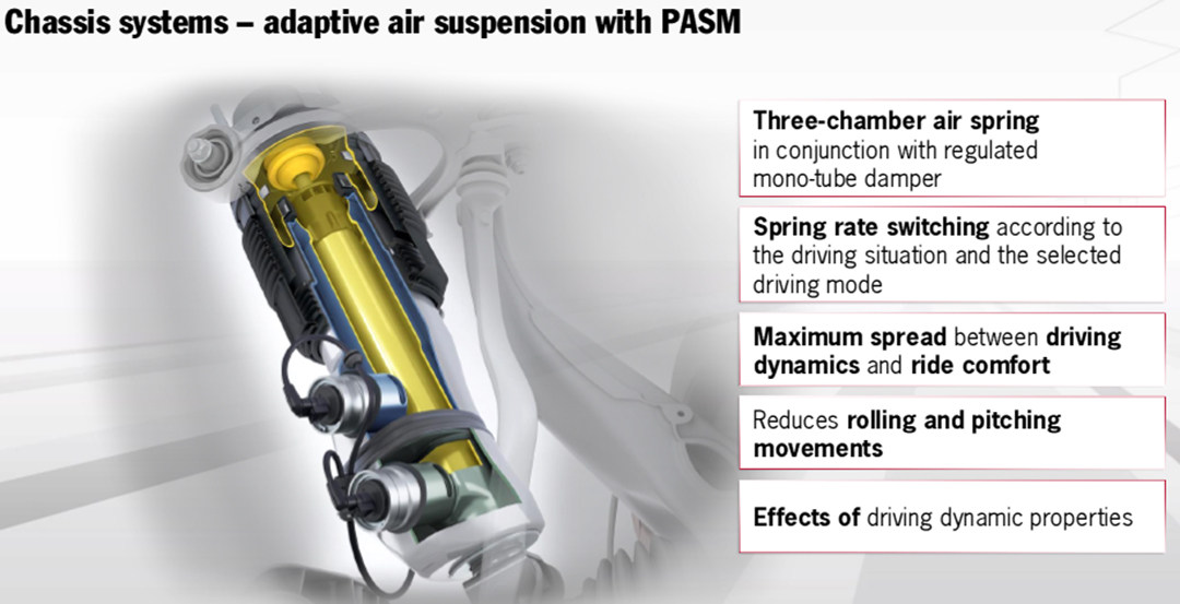 一般来说,避震分为避震机和弹簧两部分。弹簧负责支撑车身和控制中心转移,而避震则负责控制悬挂吸震和回弹的快慢来改变汽车的行驶特性。大部分使用主动可变避震系统的车型都是仅仅使用主动可调式避震,通过监测车速和过弯G值等随时调节避震的吸震和回弹硬度以改变车辆的过弯反应来改变行驶特性(和PASM类似)。弹簧由于是弹性部件很难通过电子的方法瞬间改变其硬度。保时捷这次在4D底盘控制系统上则首次使用了3层气囊构造的气动弹簧就突破了这部分的限制。