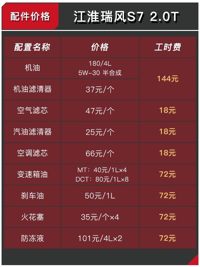 为满足相对大部分人的动力需求,本文分析瑞风S7的2.0T车型;可以看出零配件都是比较便宜,工时费也比较实惠。