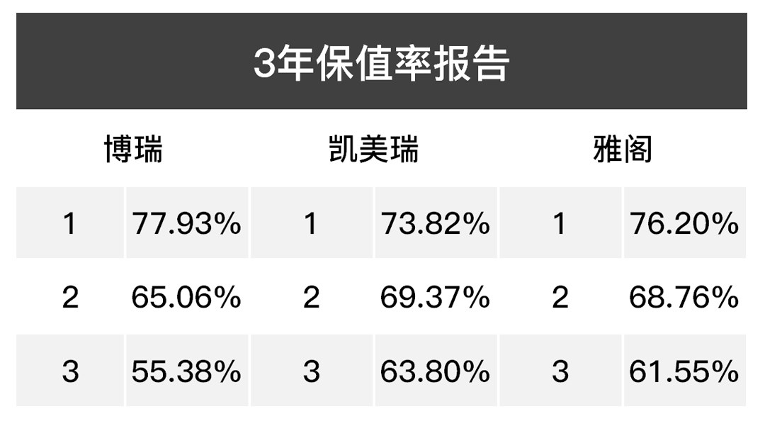 品牌力、口碑的缺失,使得博瑞等自主品牌车型的保值率相比合资车型要低上不少。根据二手车之家数据显示,使用3年后的博瑞相比丰田、本田等合资车型在保值率上有着5%的差距。哪怕和更低价的A级车相比,二手车价格同样不占优。