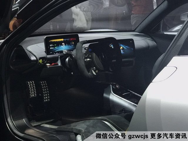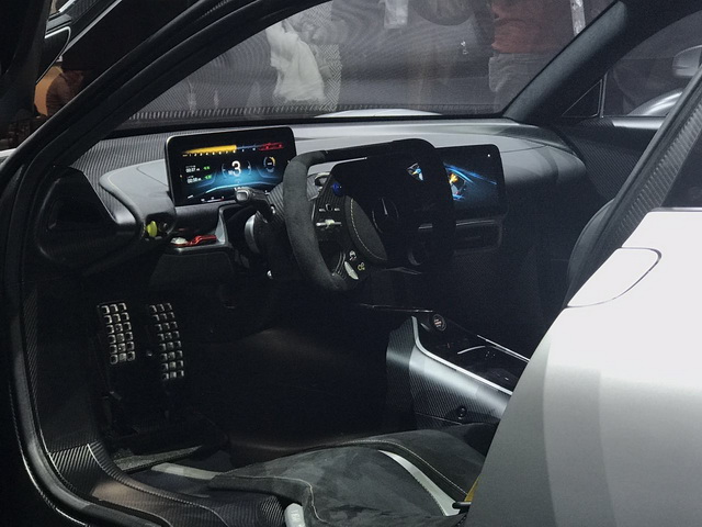 在内饰方面,AMG Project One极为简洁,两块显示屏仅显示与驾驶相关的信息,例如电量,转速,档位等。内饰的材料也以碳纤维为主,达到极致的轻量化。