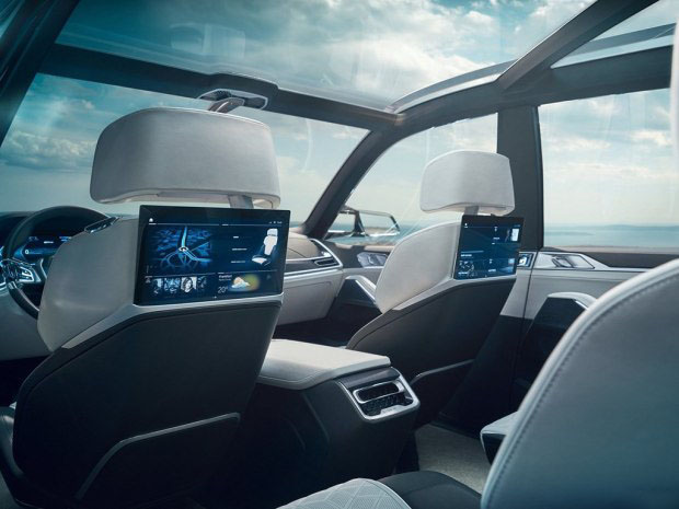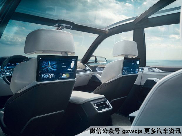 宝马X7 iPerformance Conecept内饰最大的亮点就是使用了宝马有史以来最大的全景天窗玻璃,进一步增加空间感。这块全景天窗玻璃被一个Y字型的骨架分为三部分,前面三角形的部分与前挡风玻璃连为一体。新车采用了2+2+2的6座布局,相信在空间方面不会让人失望。