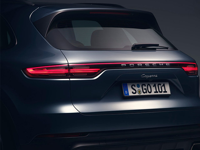 新一代卡宴长宽高尺寸为4918/1983/1696mm,与老款相比,新车车长增加63mm,高度降低9mm,轴距方面保持不变,同为2895mm。并且新款卡宴还秉承了轻量化车身的语言,大量应用了铝合金等轻质材质,比老款车型减重65kg左右。新车标配19英寸合金轮毂,还提供21寸轮毂供选装。车尾部分,新一代卡宴同样使用了像新款Panamera那样的贯通式尾灯组设计,并且尾部采用了立体式“Porsche”标致。