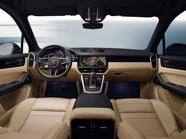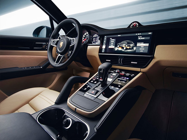 新一代卡宴内饰基本延续了新一代Panamera的设计风格,在中控台上配备大尺寸液晶屏、大部分实体按键将会被触摸式按键取代,并且将会使用全新造型的电子挡杆。除了内饰变化之外,新一代卡宴还标配PASM主动减震器系统以及四驱系统,并且首次配备后桥转向系统。至于全新三腔室自适应空气悬架以及动态底盘控制防倾稳定系统(PDCC)就是选装项目了。保时捷还为新一代卡宴配备了其新开发的Sport Chrono组件可选,这套组件可提供Normal、Sport、Sport Plus以及自定义驾驶模式选择,每个模式均会对发动机以及变速箱等进行设置,可以令驾驶者获得更佳的驾驶体验。
