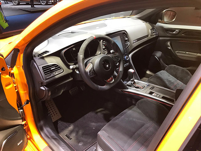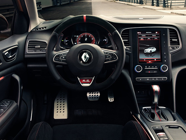 在内饰采用了新车与梅甘娜GT采用了相似的内饰布局,大量运用了红色缝线,用以突出性能车的氛围。方向盘采用了真皮材质与Alcantara翻毛皮的搭配,后方的换挡拨片很有战斗气息,在方向盘下方还带着红底白字的“R.S.”,让人瞬间打满鸡血。