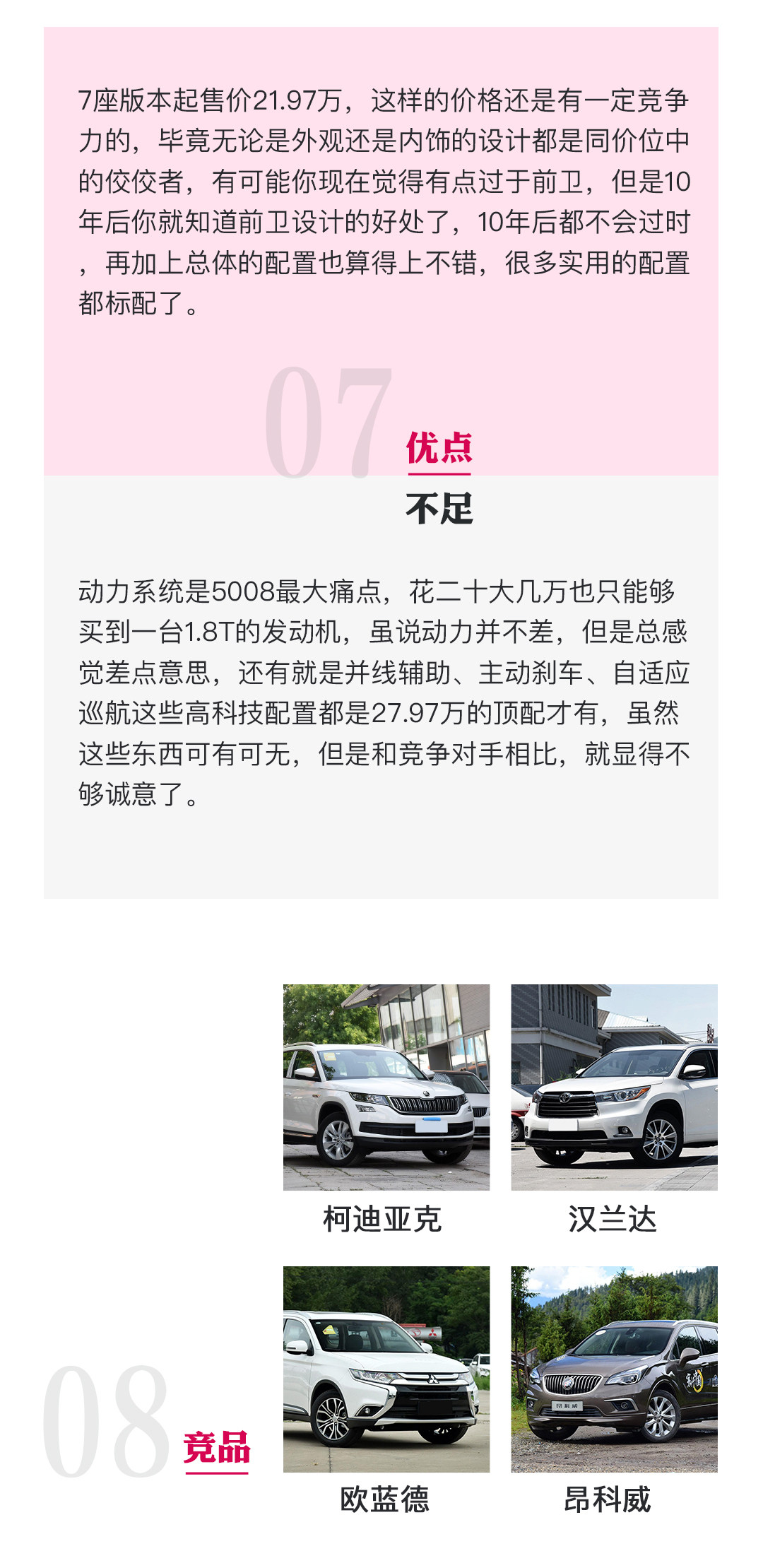 国内的消费者特别关心配置,然而标致一直不太擅长这方面,5008的配置有吸引人的地方,但是也有值得吐槽的地方,全系标配定速巡航、发动机启停、上坡辅助、多功能方向盘、换挡拨片、LED日间行车灯,这些与驾驶员密切相关的配置倒是挺齐全的。
