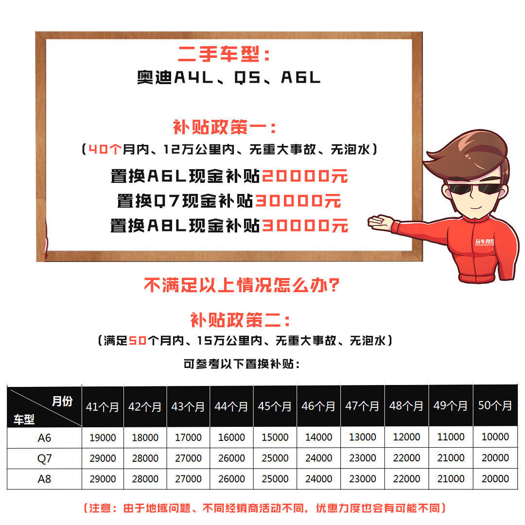 在购入新车的同时,直接在奥迪4S店进二手车置换,省心靠谱!朋友的A4L是2013年底买的,开了接近50个月,满足50个月内、15万公里内、无重大事故、无泡水的置换补贴10000元,仔细算了一下,旧车置换后的费用,感觉奥迪换奥迪挺划算,当天就下定了!