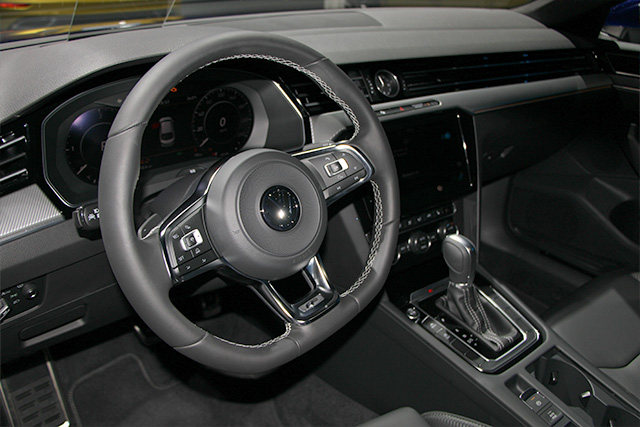 内饰设计大众Arteon依旧是延续了大众家族化的内饰风格,中控大屏、贯穿式的空调出风口、木纹饰板以及中控中央处的时钟搭配,提升了整车内饰质感,线条感较为强烈。而R-line版本还配备平底式三辐多功能方向盘以及运动座椅,提高车内运动气息。