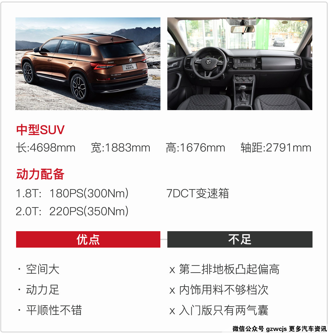 如果更喜欢沉稳的车型,柯迪亚克是个不错的选择。柯迪亚克和当红的途观L出自同一平台,一样的底盘和动力系统,只可惜同车不同命。柯迪亚克的外观由布加迪威航的设计师操刀,简洁大气,沉稳时尚,内饰也让人觉得有新鲜感,大面积的软性材质也提高了档次感,理论上很符合国人的口味。空间也没得挑剔,毕竟是可以提供7座的中型SUV。