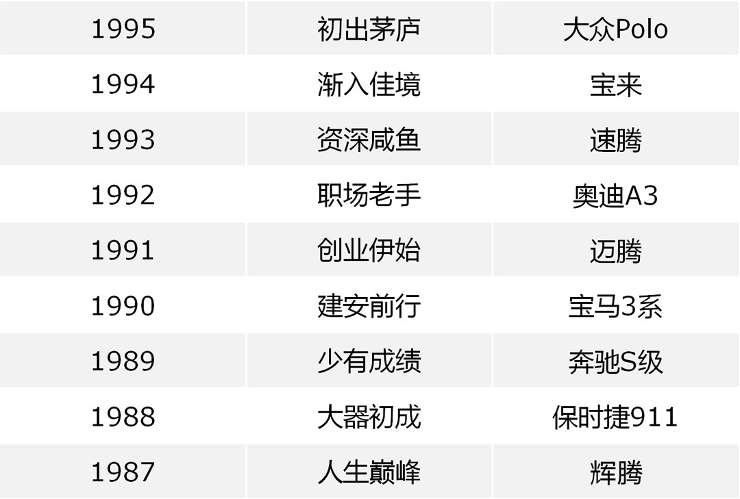 回想起着一切关于德系车的细节,似乎未曾拥有过德系的人生简直就是在忽悠自己。网上流传了一份不同年龄段应该买什么车的表格(车型五花八门),但如果替换成德系车又应该是什么车?反正教授深感严重拖了后腿,你呢?