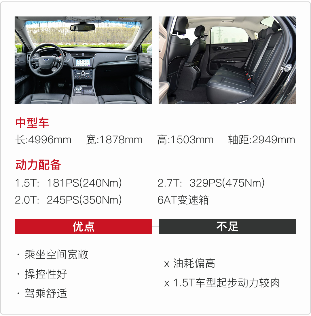开起来并不觉得它笨重,它保留了福特一贯的驾驶感受,指向精准、操控灵活。但同时底盘稳健扎实,前后悬架为麦弗逊式独立悬架加多连杆独立悬架的结构,对来自路面的细碎颠簸处理得非常得体,提供了舒适安静的乘坐环境。