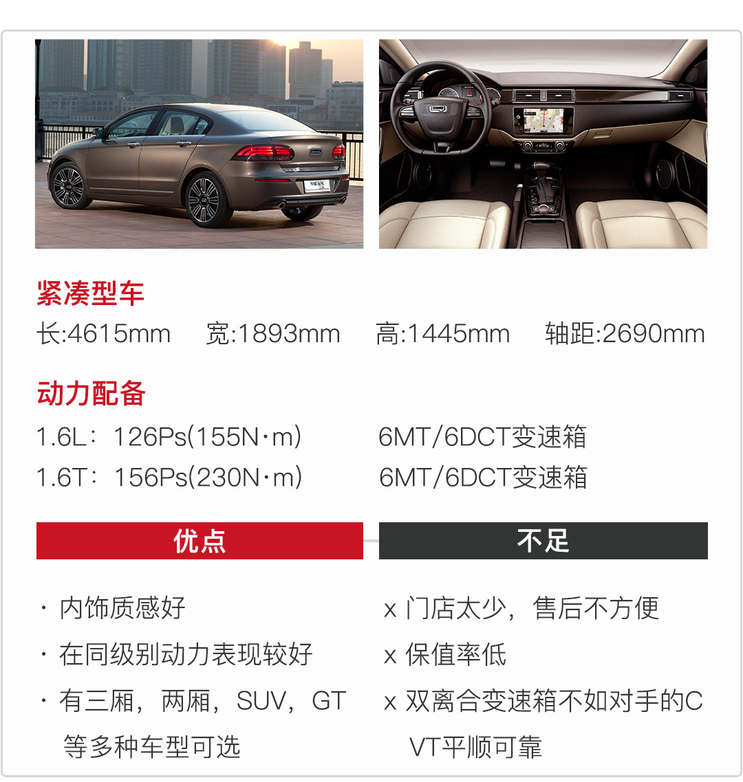 教授点评:提起观致,大多数业内人都会叹气一声。最大的问题也在于其”非主流“的身份,无论是售后还是日后转手的保值率,都是消费者担心的问题。虽然销量惨淡,但观致的车其实并不差。内饰选材比同级别许多对手都厚道,底盘厚实,1.6T车型的动力表现也可圈可点,除了轿车,还有SUV等众多车型可选。如果你家附近就有观致的4S店,教授推荐值得去了解一下的。