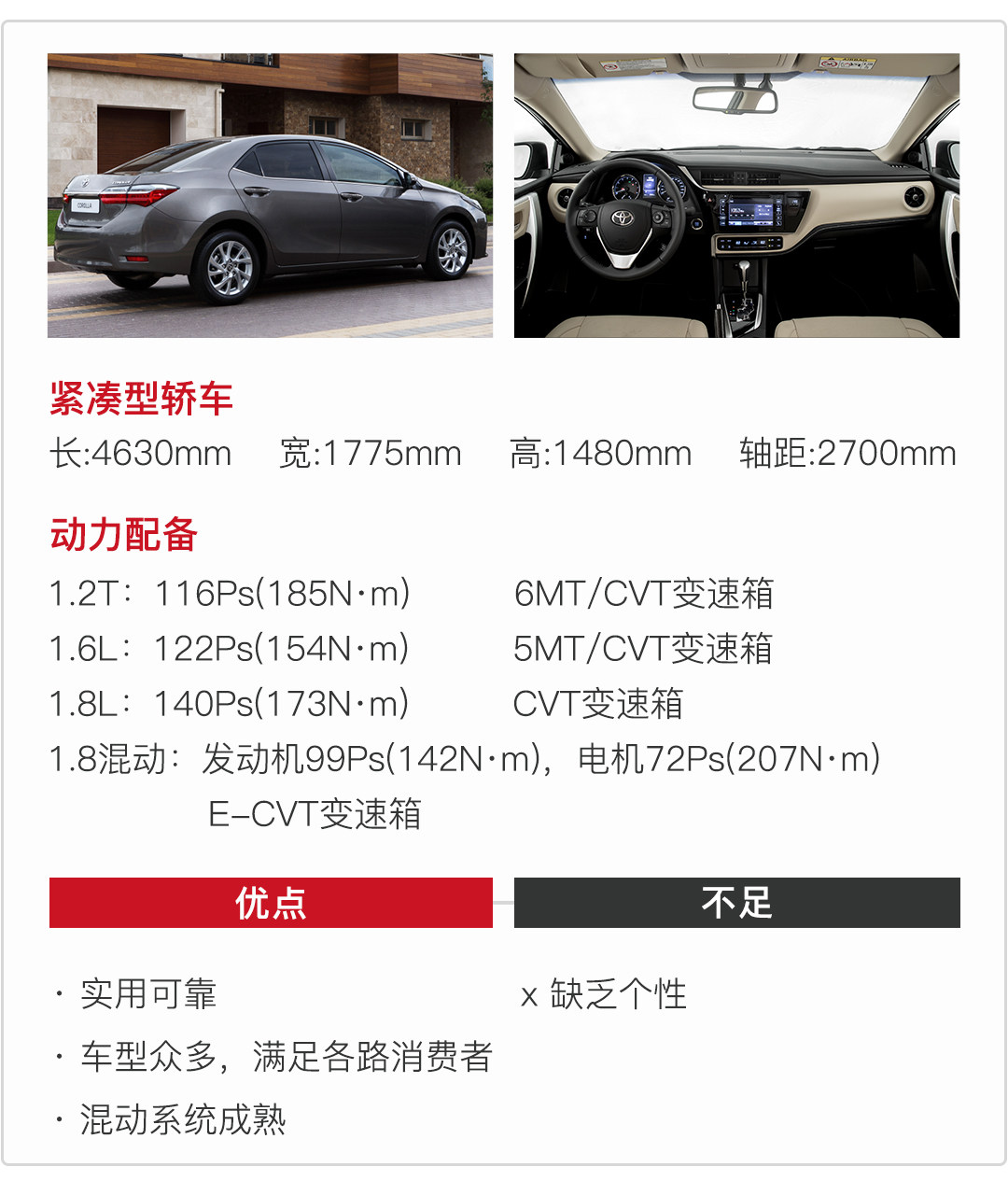 教授点评:作为汽车史上最为畅销的车型之一,卡罗拉用事实告诉世界,像它这样的车永远是主流。乘坐舒适,加之丰田的可靠性一向有口皆碑,随着能源短缺,混动和涡轮车型也加入到卡罗拉的大家族中。对于一台追求实用舒适的车来说,教授实在想不到卡罗拉有什么明显的缺点。