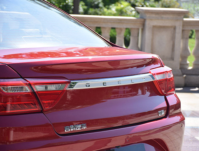 车尾部分,新增了一体式的扰流尾翼设计,熏黑色的下护板加入了镀铬装饰条,增强了整车的运动气质。和现款车型相比,新车的尾灯尺寸将更大,并采用了分体式的设计,两组尾灯中间由带有英文标识“GEELY”字样的镀铬条相连。另外,新车的牌照安装位置向下移动,位于后保险杠处。