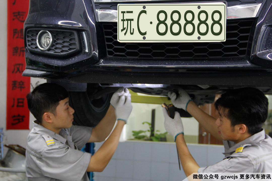 教授向店长提出要看看车辆保养实况,刚走进保养车间,正好碰上两名技师对车辆进行检查。