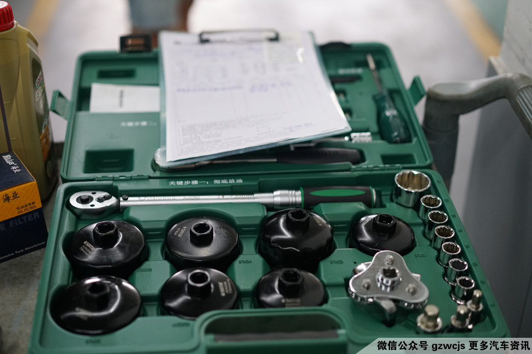检查车况OK后,技师便更换机油机滤。看着专业的更换机滤工具,教授更放心了,毕竟能如此规整的摆放工具,部分4S店可要学习一下了。