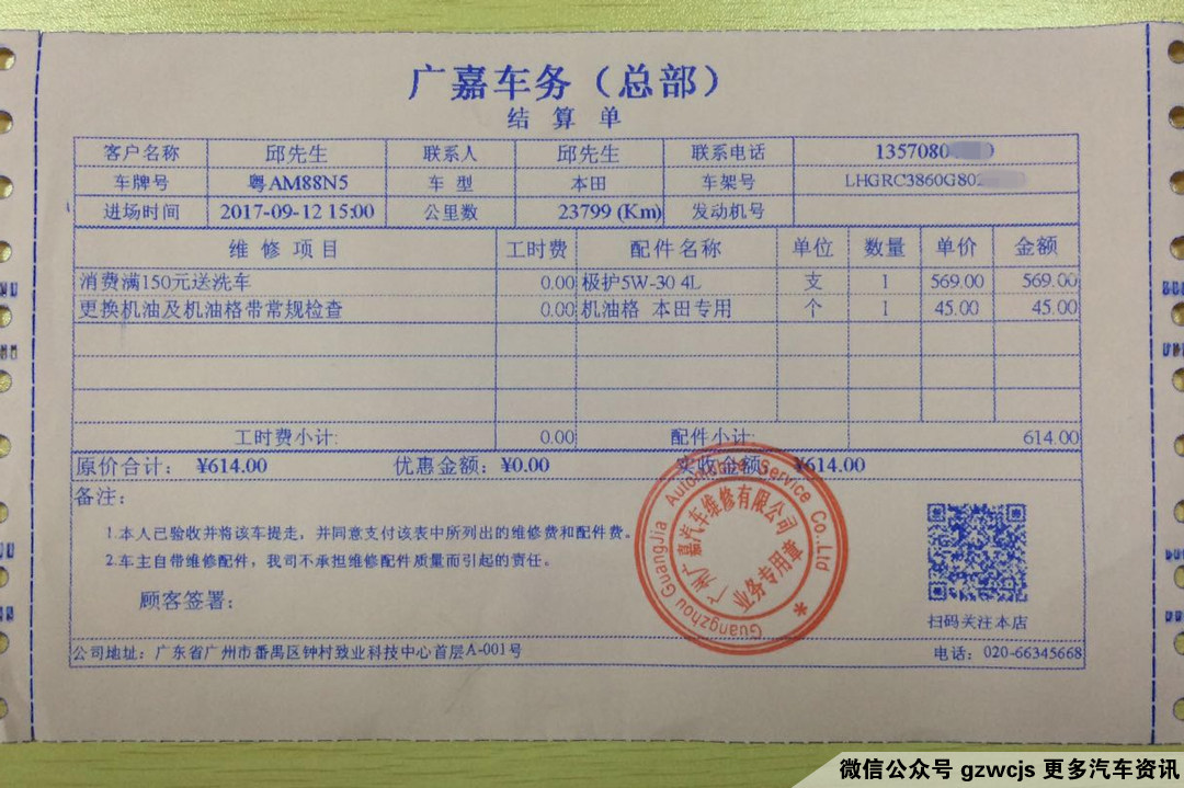 车辆在清理内饰时,教授回到休息区。服务顾问已将保养费用单算好,教授发现在嘉实多护车保养站做小保养,只需要购买机油及机油滤芯,消费满150元即免收工时费!粗略计算与4S店保养差价不大,而且能用上嘉实多极护全合成机油,以及享受专业保养团队服务,教授认为这钱花的值!