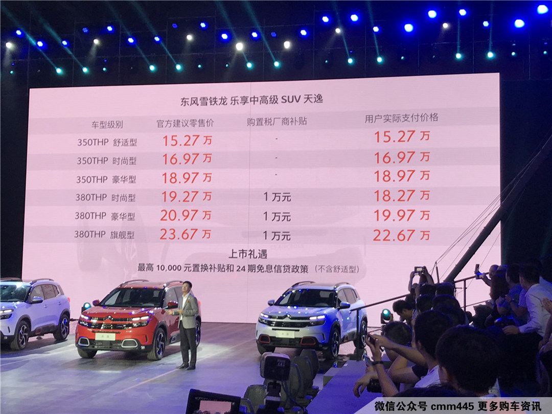 在天逸上市之前,东风雪铁龙官方预售价格为15.37万,彼时就已引起不小的关注度;而实际上市后,价格门槛再降1000元人民币,最终官方指导价为15.27万—23.67万,而且在上市发布会之时,官方直接对于380THP(1.8T)车型进行1万元购置税补贴优惠政策,上市则“官降”的举措在合资厂商内甚是罕见。