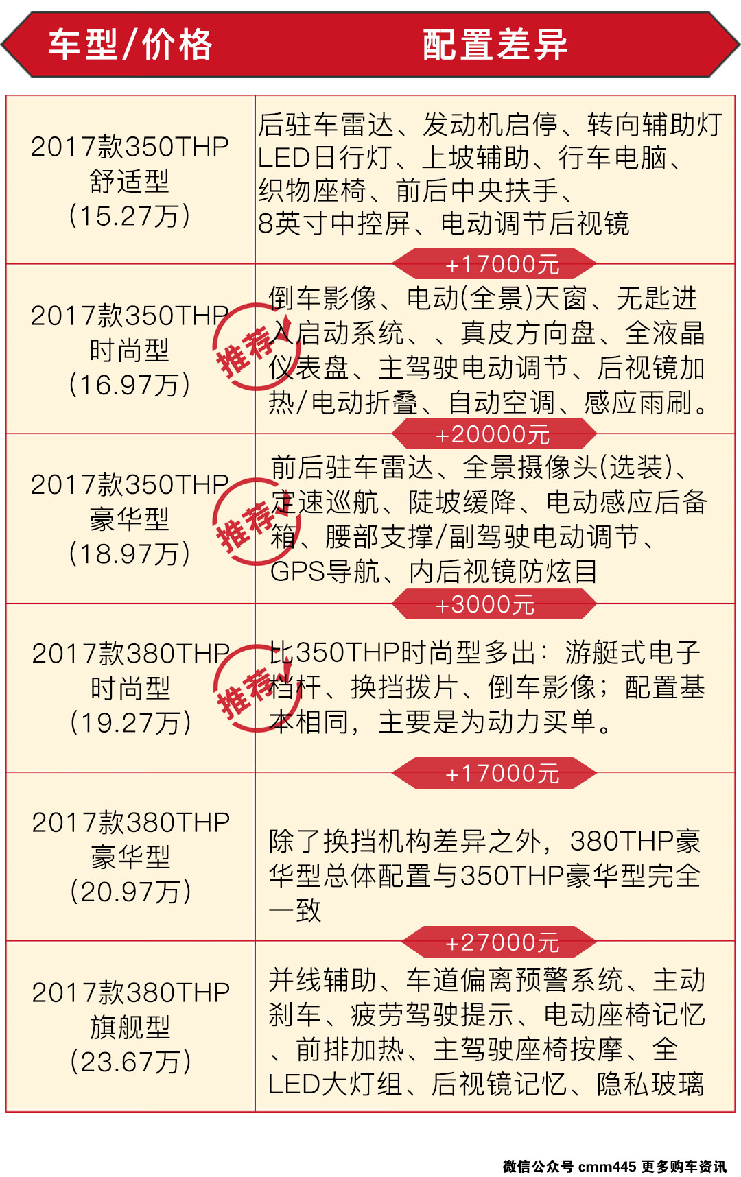 如果是对于动力需求和电子换挡机构的需求并不高,只是单纯想提升用车时的档次感体验的话,其实350THP的豪华型是非常值得考虑的选项,前后雷达、主副驾驶电动调节这等便利性更出色的配置都有提供,齐全度已经很高,而配置几乎完全一样的380THP豪华型则要加2万元预算,性价比就显得不是那么高了。