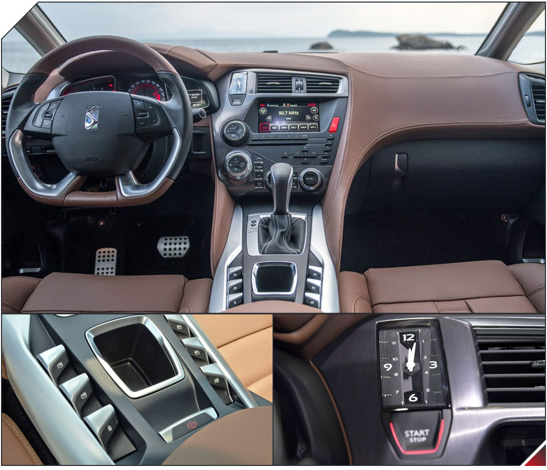 进入车内,展现在你面前的便是法系的奢华内饰布局,同时浪漫的气氛由外到内丝毫没有减弱。除此以外,DS5的车内每一处小细节都让你感觉你在驾驶的是一辆独特的车,例如一键启动上面的时钟、挡把旁边放水杯的地方,其独特之处让这款出不失运动氛围。