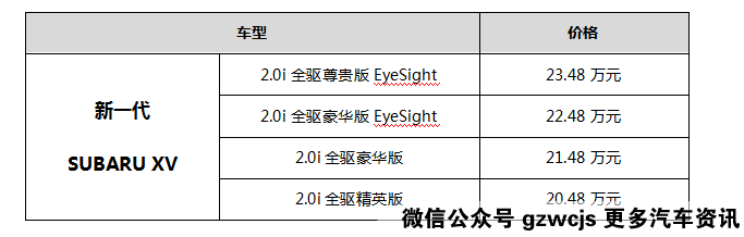 本次发布上市的新一代SUBARU XV共有2.0i全驱精英版、2.0i全驱豪华版、2.0i全驱豪华版EyeSight、2.0i全驱尊贵版EyeSight四款车型,价格区间为20.48-23.48万元,为每一位年轻消费者提供了极具吸引力的选择。