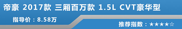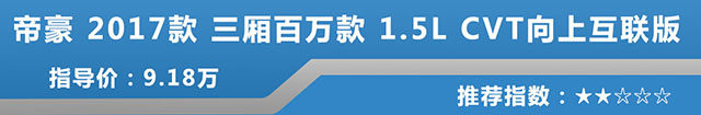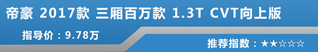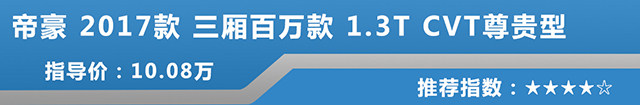 最后总结一下,手动向上版与CVT向上版是性价比最高的配置,设计极具原创度,外形运动,内装优雅,配置完全能满足中国消费者的基本需求,且帝豪目前的市场优惠幅度比较大,强烈推荐选择。