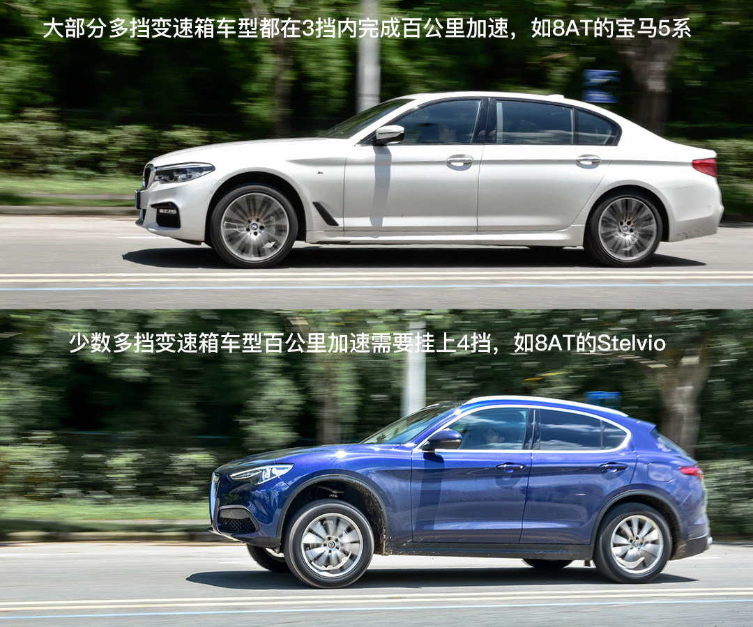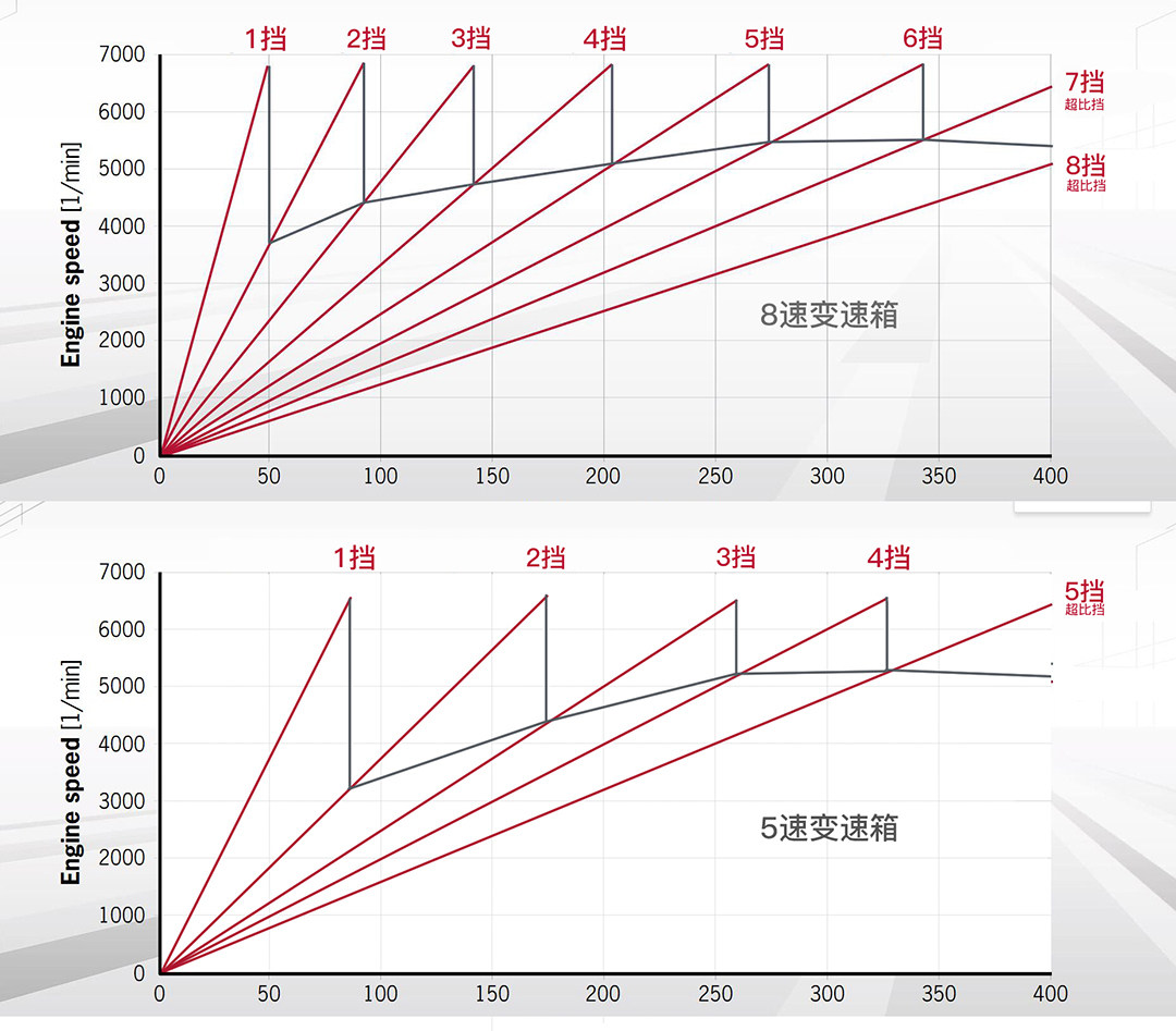 多挡变速箱容易有更密的齿比,每次换挡后转速下跌更少,引擎转速更容易维持在Power Band内。