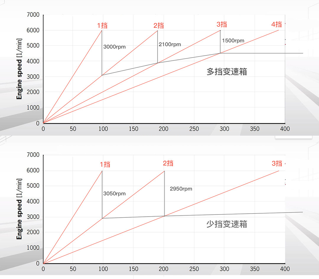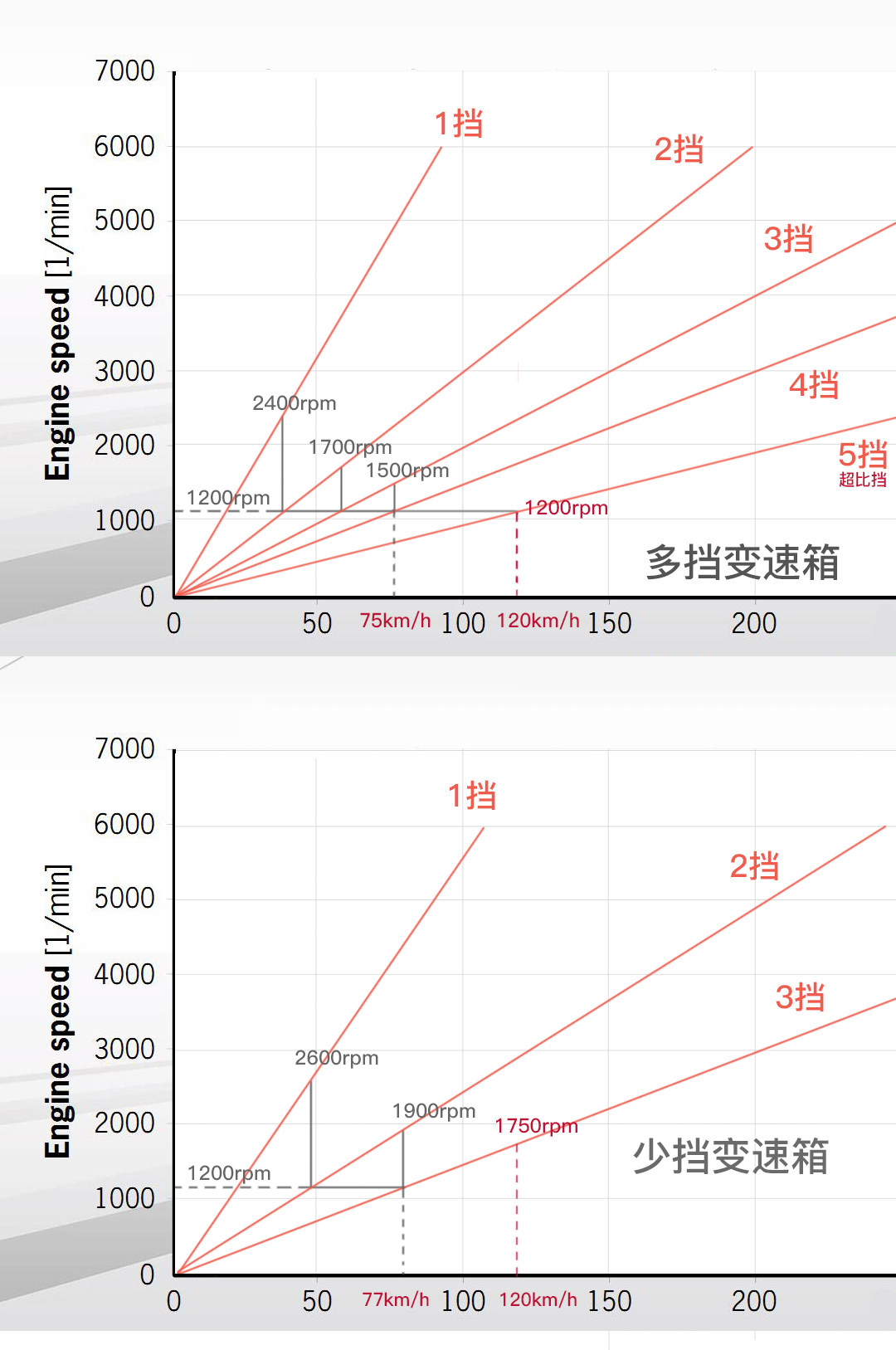 图上可见,多挡变速箱几乎每一挡都可以在更低的转速就升上高一个挡位,而120公里/小时巡航时也能有更低的转速,因此能够有更佳的理论油耗表现。