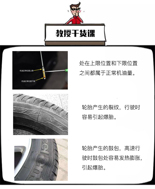 正所谓“预先善其事,必先利其器”,在出行前一定要检查车况是否良好,打开发动机盖,拉出机油尺,检查机油量是否充足或者是机油是否会变黑,如果油量不足或者是发黑的话则需要到专业的保养机构进行添加或更换。轮胎的检测同样重要,出行前检查轮胎表面是否有异物,鼓包或者开裂,胎压是否正常等,在高速行驶时爆胎会造成非常严重的车祸,所以要多留意。
