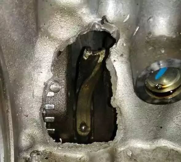 大概就是这样 可以看到,发动机壳体已经被击穿了。很多人以为的爆缸就是这样,其实并不是,借这个机会和大家聊聊爆缸是怎么回事。 我们通常说的爆缸一般分为这几种情况: 1、温度过高导致散热不足 最常见的,因为发动机运转温度过高,活塞受热膨胀卡在气缸内,无法运作导致发动机报废。如果压力过大,活塞又动弹不得,就会冒出火焰。 还有一种就是拉缸,拉缸是指活塞受热变形后,和气缸壁摩擦出划痕,导致气密性不严,一般会冒出青蓝色的烟。 2、润滑不足。 帖子里,车主承认进行了改装,但是没有使用更高标号的机油,而是按照说明书使用了0W-20的合成机油。我去找了找十代思域的说明书,发现虽然可以使用0W-20的机油,但是也加了这么一句话:0W-20机油旨在提高燃油经济性。同时可用的还有0W-30和5W-30两种粘性更高的机油,所以这可能是一种原因。 3、进气和点火正时调整不正确导致。 当发动机的压缩行程到达上止点的时候,需要立马往下做工,所以一般会在到达上止点之前,发动机就进行点火,从点火到活塞运行到上止点这段时间,曲轴转动的角度就叫做点火提前角。在火花塞还没有进行点火,油气混合物已经在压缩行程中自行燃烧起来,这种现象就叫做早燃。 早燃导致气缸压力上升,不停对活塞施加冲击力,而本田又对连杆的轻量化做得很激进,由此可能导致了连杆断裂,活塞击穿了发动机壳体。 可是发动机怎么会发生早燃的情况呢?恐怕这和涡轮增压发动机有密不可分的关系。随着涡轮发动机的普及,很多涡轮发动机的最大扭矩可以在更低的转速下爆发。虽然有利于燃油经济性,但是当发动机处于低转速高负荷时,曲轴转动相同角度的时间更长,压力过大更容易发生早燃现象,也被称为低速早燃。 车主在帖子里发生爆缸的位置是类似小区里的道路,不会有多高的转速,这会不会是原因呢? 仅从帖子有限的描述,我们并不能随意地下定论。不仅高负荷会导致发动机爆缸,比如说进水,也可能诱发爆缸。但我们可以确定的是,当发动机出现问题,像拉缸,只要马上停下,不再让发动机继续运作,是可以对发动机进行修复的。强行运作的后果就是缸体会被里面的零件击穿。 所以我们在日常行驶中,要多多留意车辆的情况,一旦有什么不对劲的时候要及时检查。更重要的,就是做好车辆保养,从根本上解决问题才是爱车的表现。