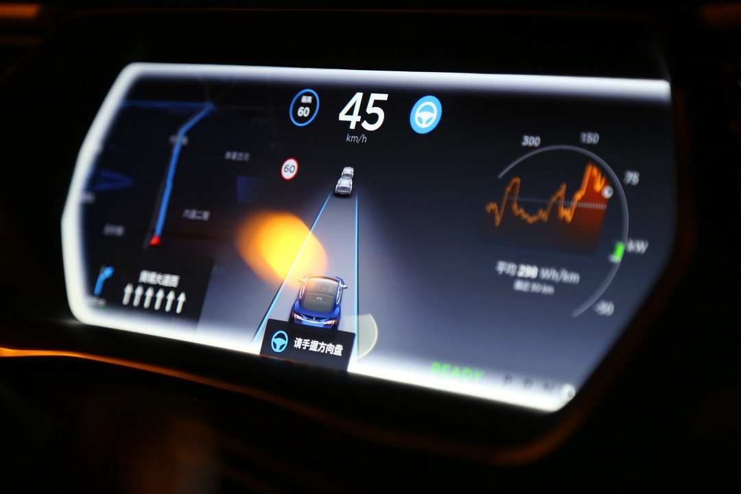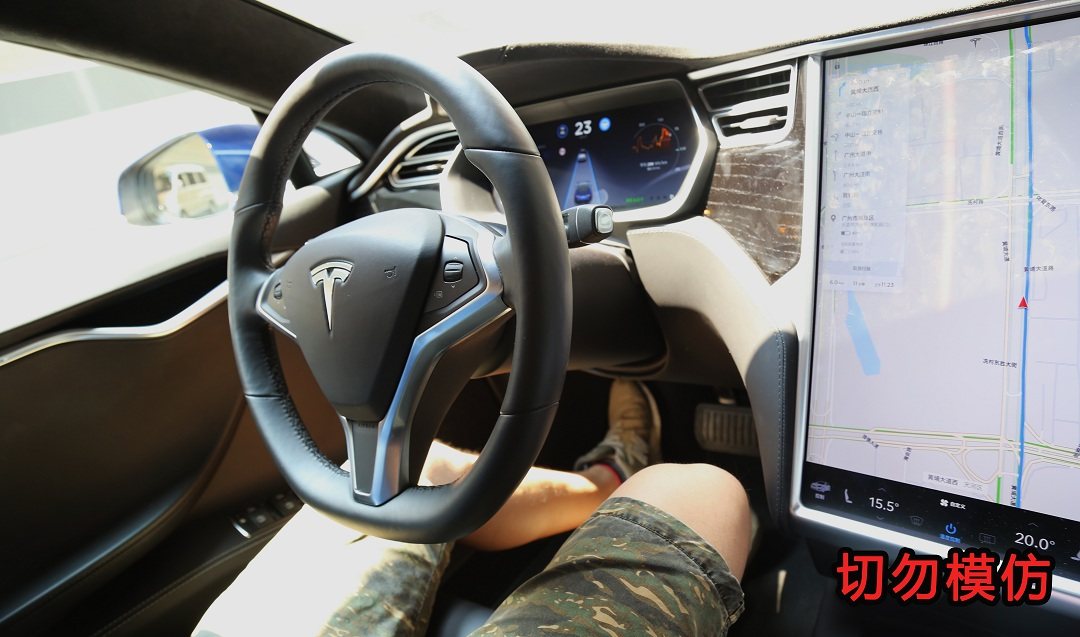左边的标志变为蓝色表示已经开启定速巡航,左边的方向盘标志变为蓝色表明开启自动辅助驾驶,这个时候,你就可以解放双脚了,特斯拉会自动根据情况控制驾驶和制动,并且可以修正方向盘,但是仍需要预备刹车以防突发情况。