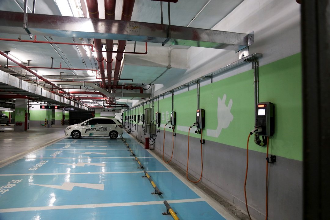 同一个停车场也有其他充电桩,有一辆共享汽车正在充电