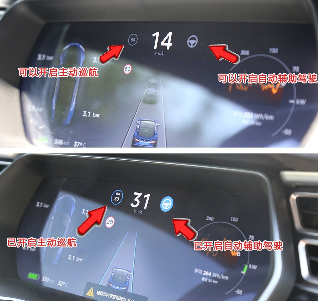 自动辅助驾驶开启的条件是路面有标线或者前方有车辆。当汽车识别到路面有标线,仪表盘上会显示出灰色的方向盘标志,表明当前路面可以开启自动辅助驾驶;灰色数值表明可开启主动巡航。