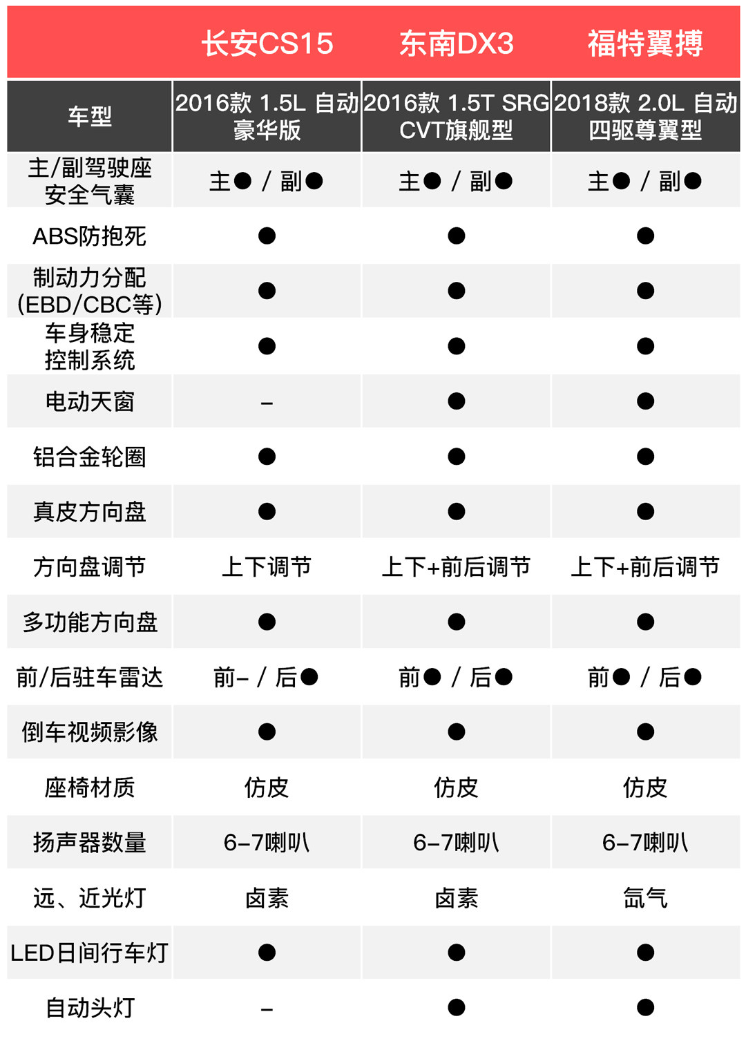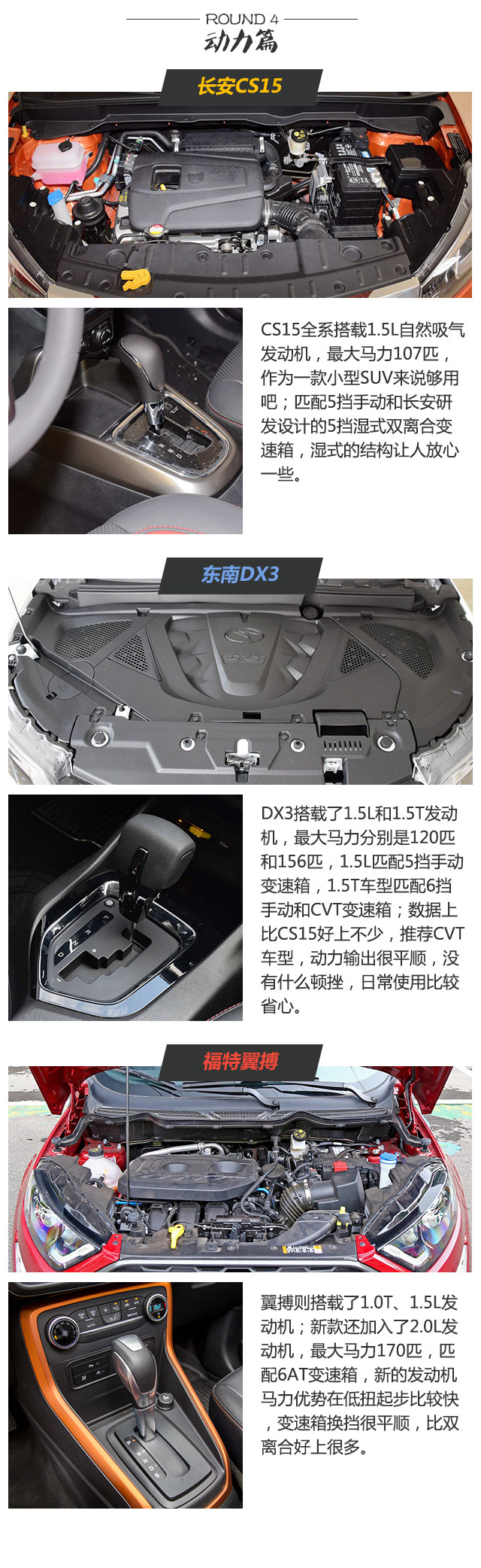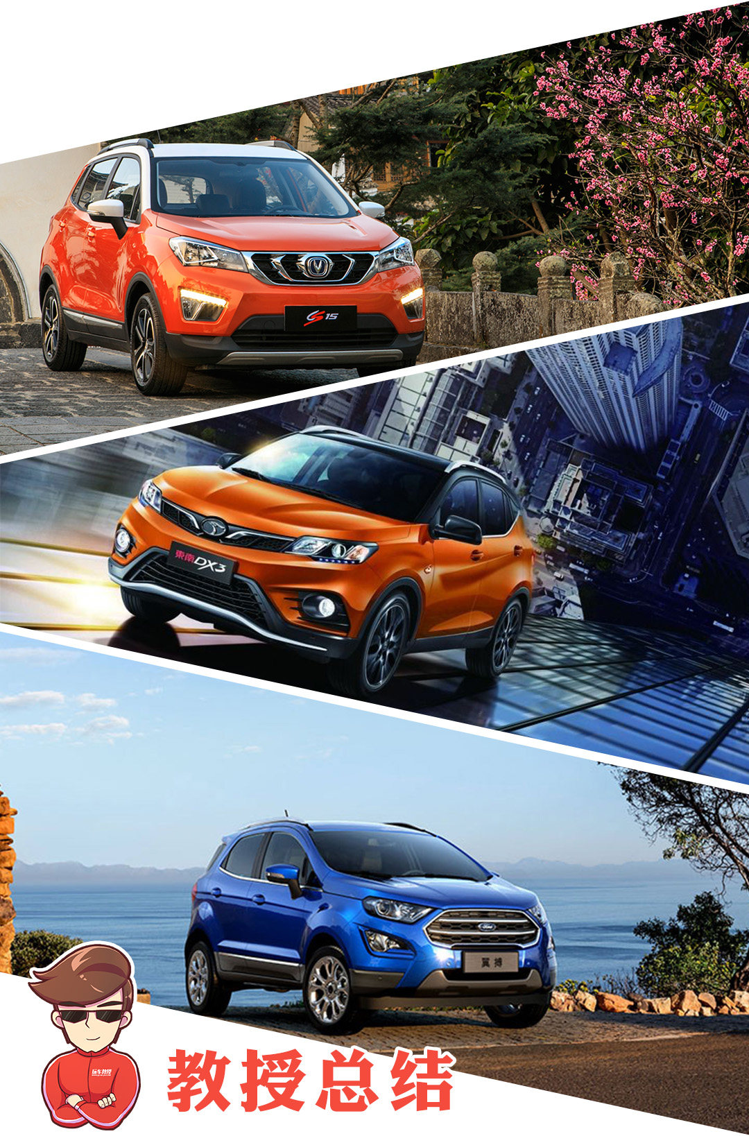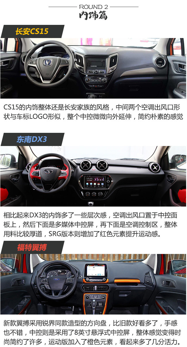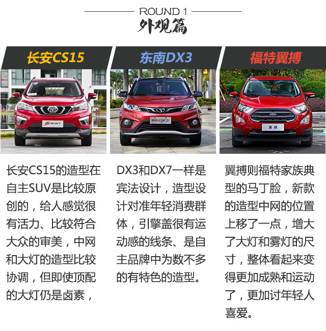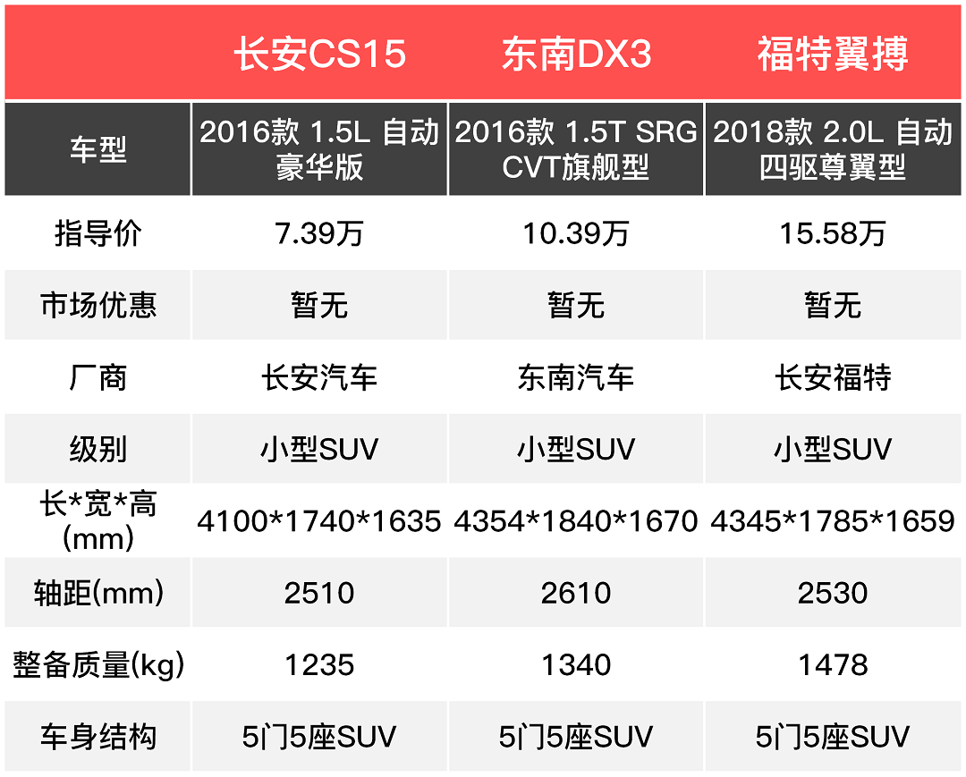 本次推荐的车型分别是:长安CS15(2016款 1.5L 自动豪华版)指导价7.39万元;东南DX3(2016款 1.5T SRG CVT旗舰型)指导价10.39万元;福特翼搏(2018款 2.0L 自动四驱尊翼型)指导价15.58万元。