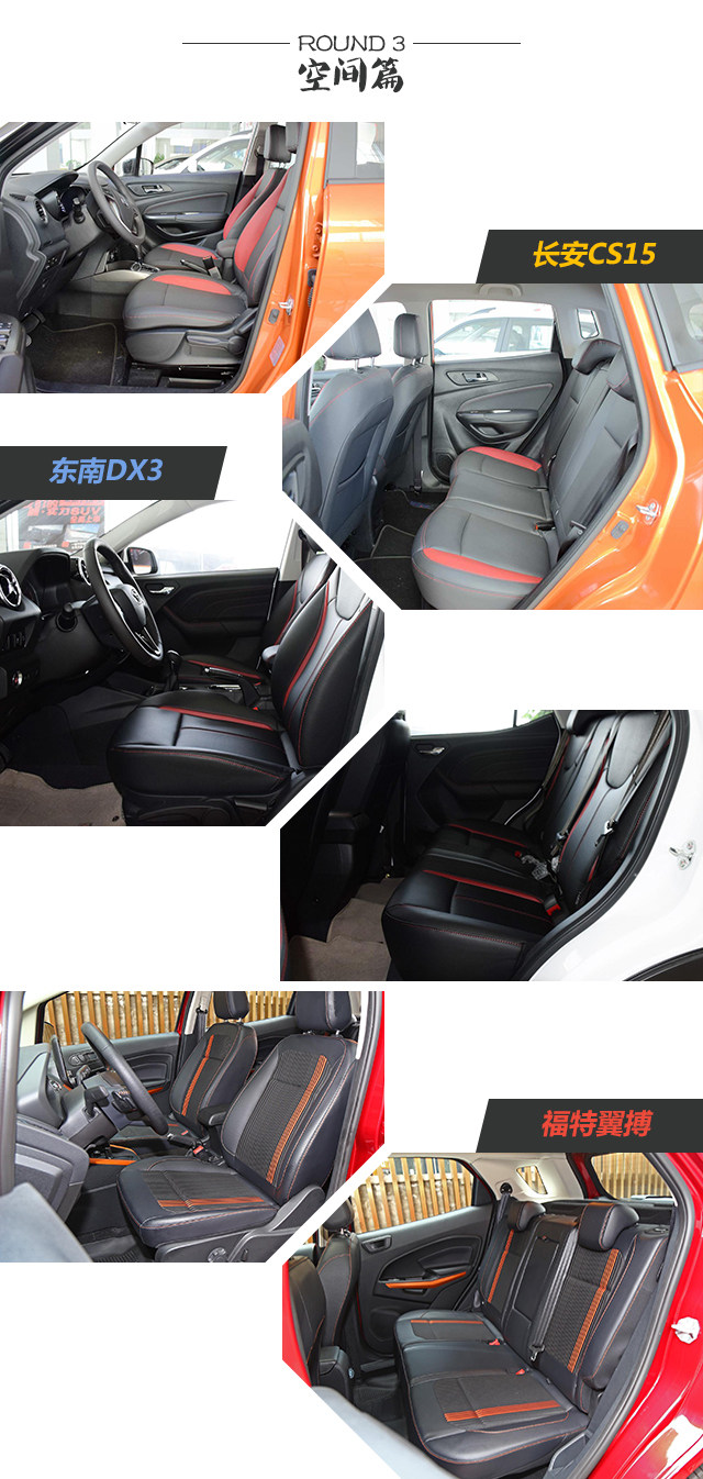 空间方面,三款车都是小型SUV,头部空间三者相当,至于后排腿部空间,DX3和CS15较好一点,最大腿部距离分别是870mm和890mm,而翼搏只有810mm,其实三者差距不算太大,身高1米7左右的成年人日常乘坐还是挺舒适的。