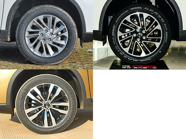 在轮毂方面,传祺GS4提供3款铝合金轮毂,从左到右,从上到下分别是17寸多辐轮毂,17寸多辐熏黑轮毂和18寸多辐轮毂。其中17寸多辐轮毂在舒适版中提供。
