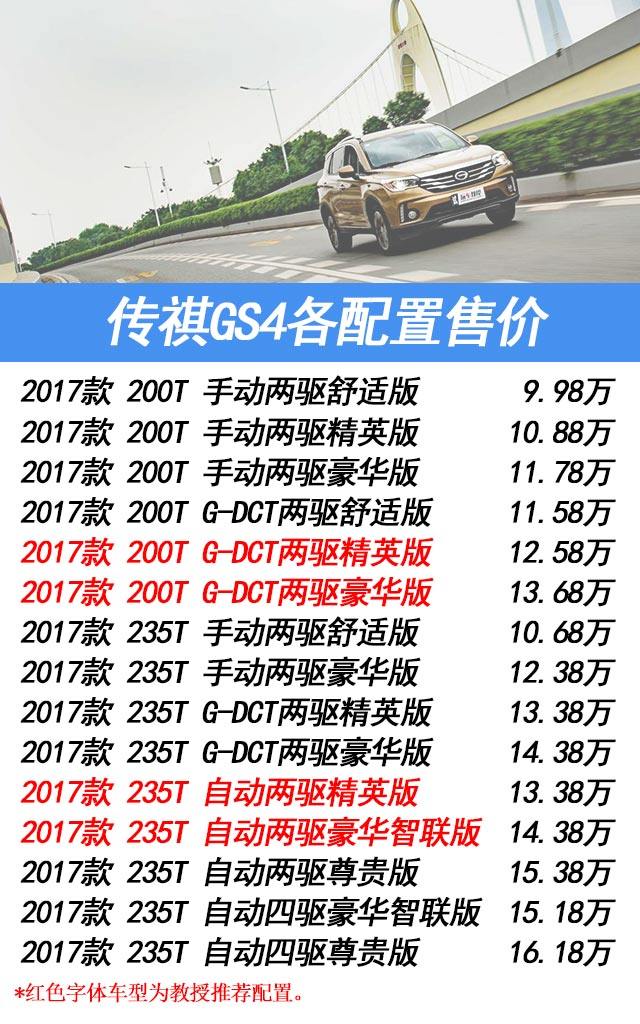 总结:GS4的低配配置在这个价格有点拿不出手,太少了,所以教授会倾向加1到2万去买精英版或者豪华版。至于尊贵版,教授觉得除了氙气大灯之外,其他配置不是十分必要。还有一点要注意的就是购买1.5T的话,教授会强烈推荐6AT的版本。