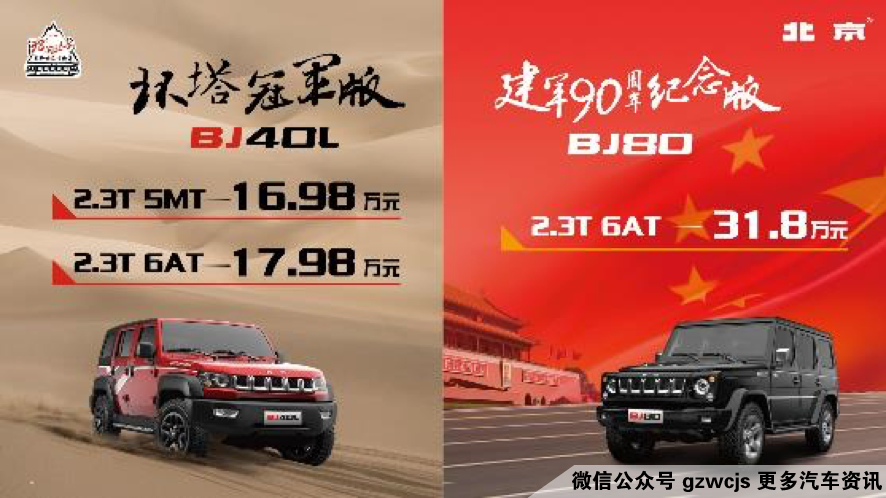 北京(BJ)40L环塔冠军版共有两款车型,官方指导价为16.98万元和17.98万元;北京(BJ)80建军90周年纪念版,指导价为31.8万元。此次上市的两款新车,在车辆外观、内饰及技术方面进行了全面升级,以过硬的产品实力,捍卫中国高端越野第一车的霸主地位。