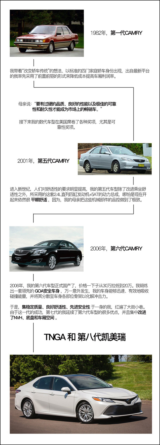 我叫CAMRY,大家也叫我凯美瑞。我的成长和张伟异曲同工,小时候以“可靠性”来呵护,青少年时期用“舒适性”和“安全性”来不断修正,长大了借“TNGA”来放飞梦想。