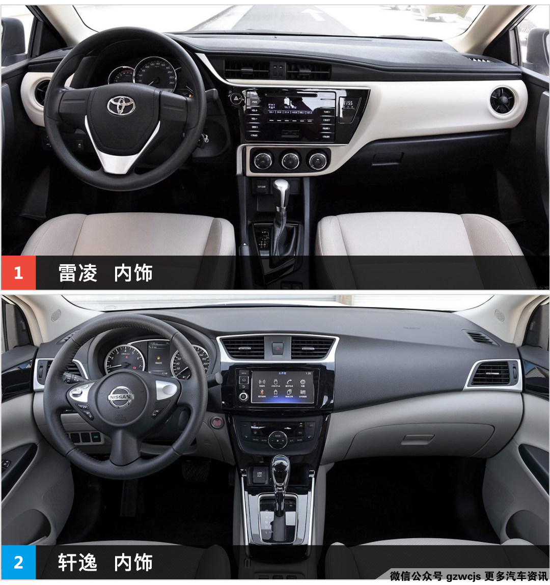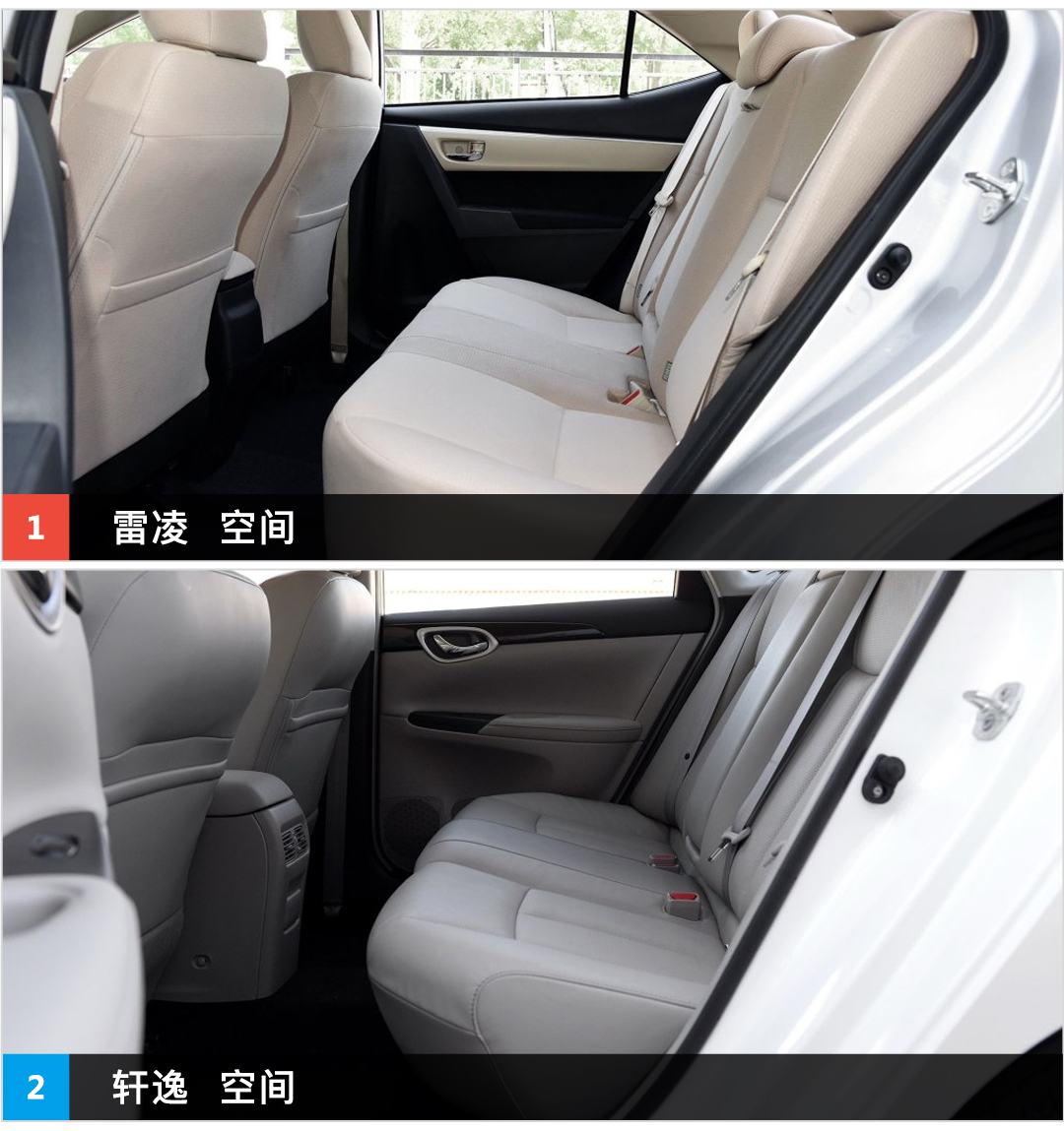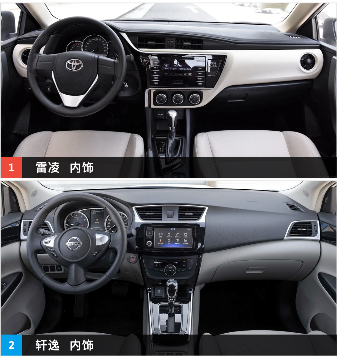 进入到车内,两款车型有着非常明显的不同,雷凌采用了非对称式的设计,而轩逸采用的传统的中控布局。同时两者在内饰用料上同样有着很大的差异,雷凌非常慷慨得采用了软质的材料,选择提供的则是搪塑工艺。