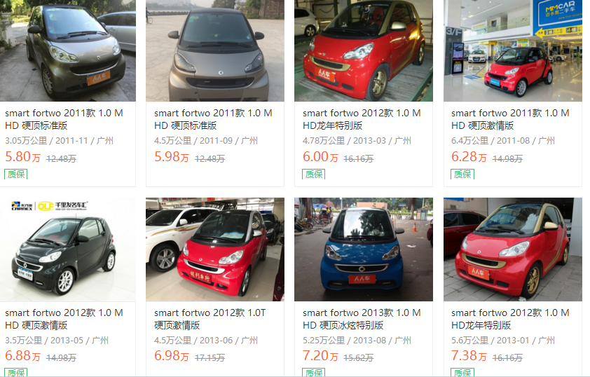 我们以广州市场为例,目前这款车型在二手市场中最低的价格为5.80万,车况稍微好的车型价格也只是10.98万。不过smart fortwo有一个不好的地方就是不容易进行第二次的转卖,所以如今很多二手车商都不愿意去收这款车。但是对于一些想玩个性却又缺乏一辆代步车的潮流人士而言,用最底的价钱购买到一辆二手的smart fortwo是一个非常划算的事情。