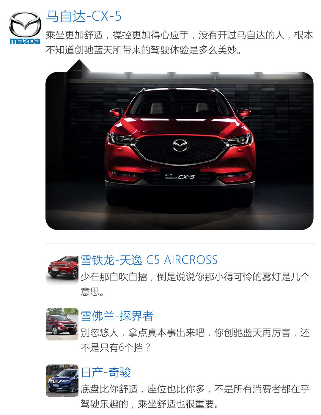 教授辣评:说是换代,但在我看来也只能算是“小换代”,毕竟底盘、动力系统都并没有明显的变化,只是外观、内饰、以及配置进行了一些微调,而上一代车型经常被诟病的NVH不够好,这一代车型也通过增加隔音材料来改善了。总体来说,新CX-5带来的惊喜并不大,但以一辆城市SUV的标准来考量,它各方面又已经做得很到位了。