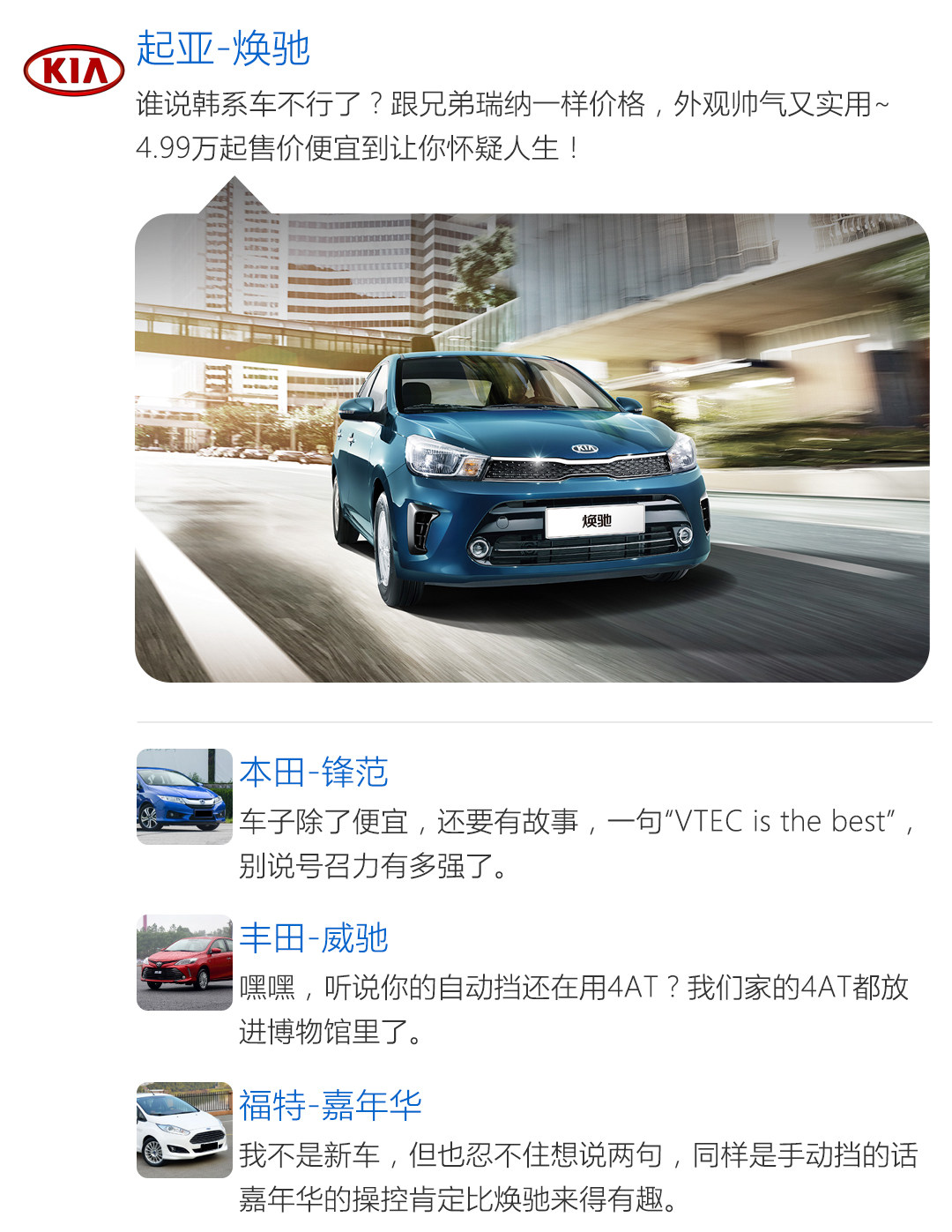 教授辣评:刚刚上市的焕驰,搭载1.4L发动机和5MT/4AT的变速箱,定位比K2低,除了外观时尚之外也没什么谈资了,让人惊喜的是它低于5万元的起售价,纵观各大合资品牌,很少有指导价这么低的轿车,看来起亚现代急需一辆热销车来提振士气,但除了外形和价格以外就乏善可陈焕驰能否成为这样的角色?我是持着保守意见的。