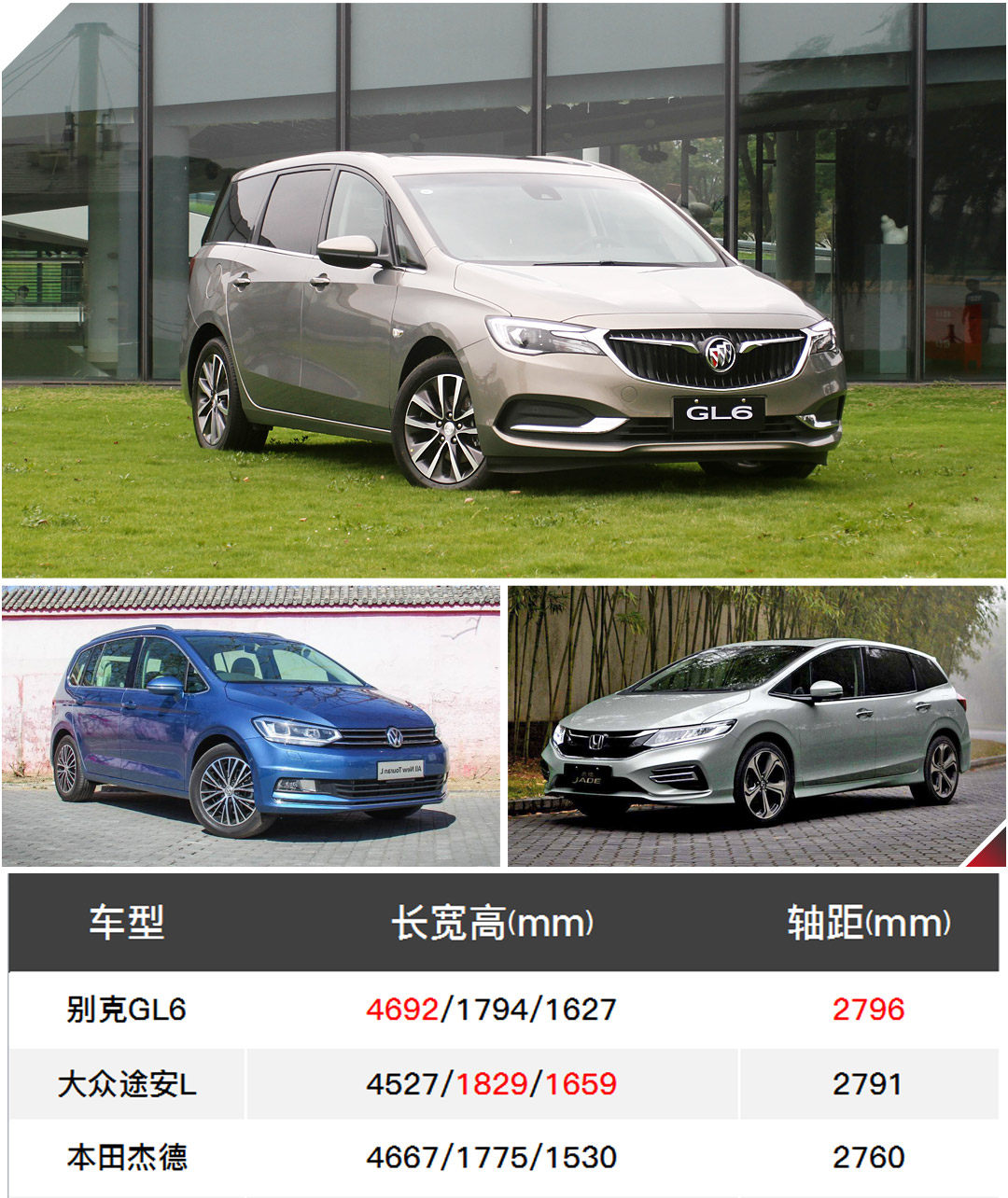 在说设计前我们还得先看别克GL6的车身尺寸,毕竟作为一台MPV必须得有硬数据作为支撑,从实车来看GL6可一点也不小。实际上也是如此,相比途安L与杰德,GL6也略大一些。