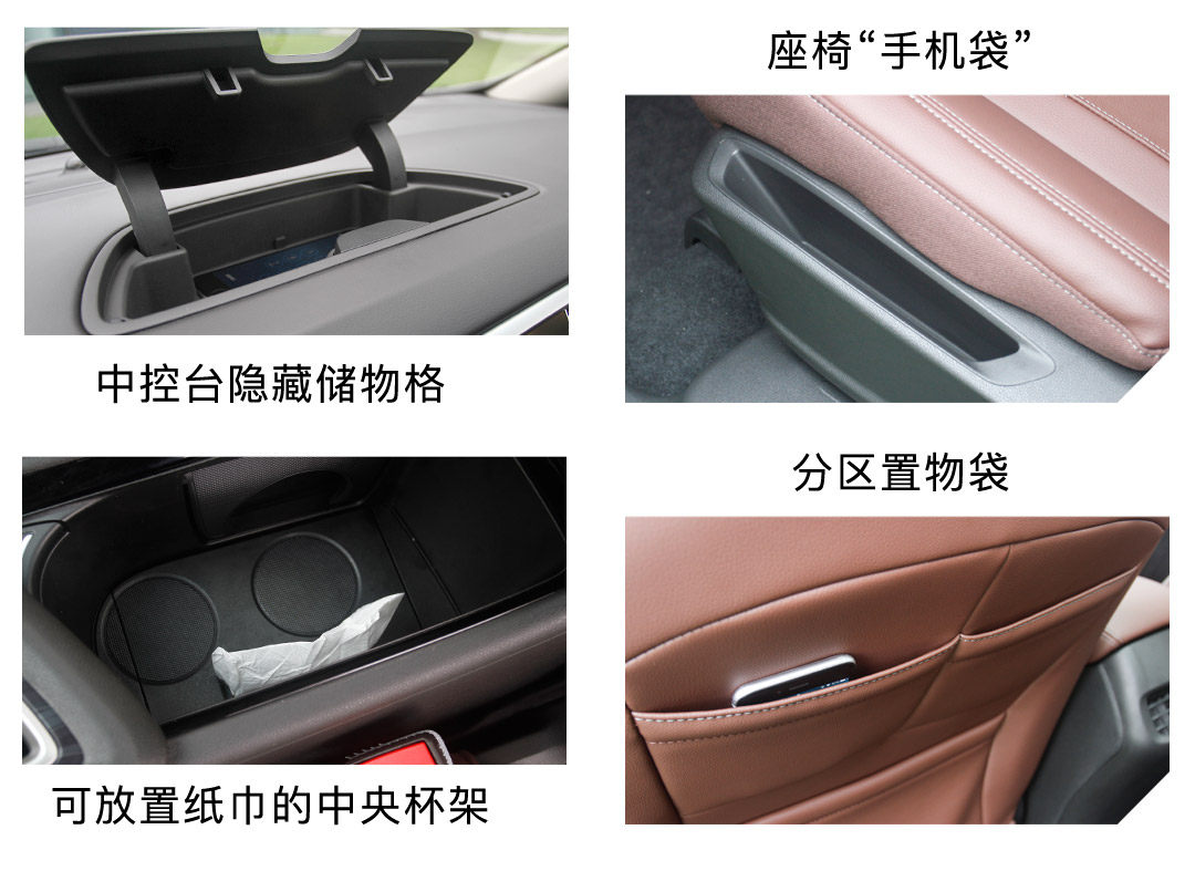 说完乘坐,咱们再看储物空间(全车多达43处),那些常见的教授就不多提了,就说说别克GL6上一些有意思的设计,比如前排中央杯架有巧思,布置了可以放置纸巾的隐藏格,这点还真的很少见;其次座椅靠背处也设计了分区置物袋,而二排座椅旁还有个“手机袋”,人性化方面必须点赞。