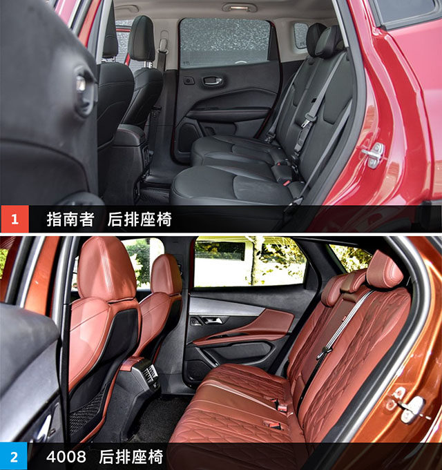 在尺寸方面,4008无论是长宽高还是轴距上都比指南者要大,最直接的反应就是在乘坐的空间上,两者均配备后座出风口和中央头枕,座椅宽大对全身的包裹都很好,对后排乘客的照顾很到位,由于有四驱车型,指南者后排隆起较大,影响乘坐舒适性,