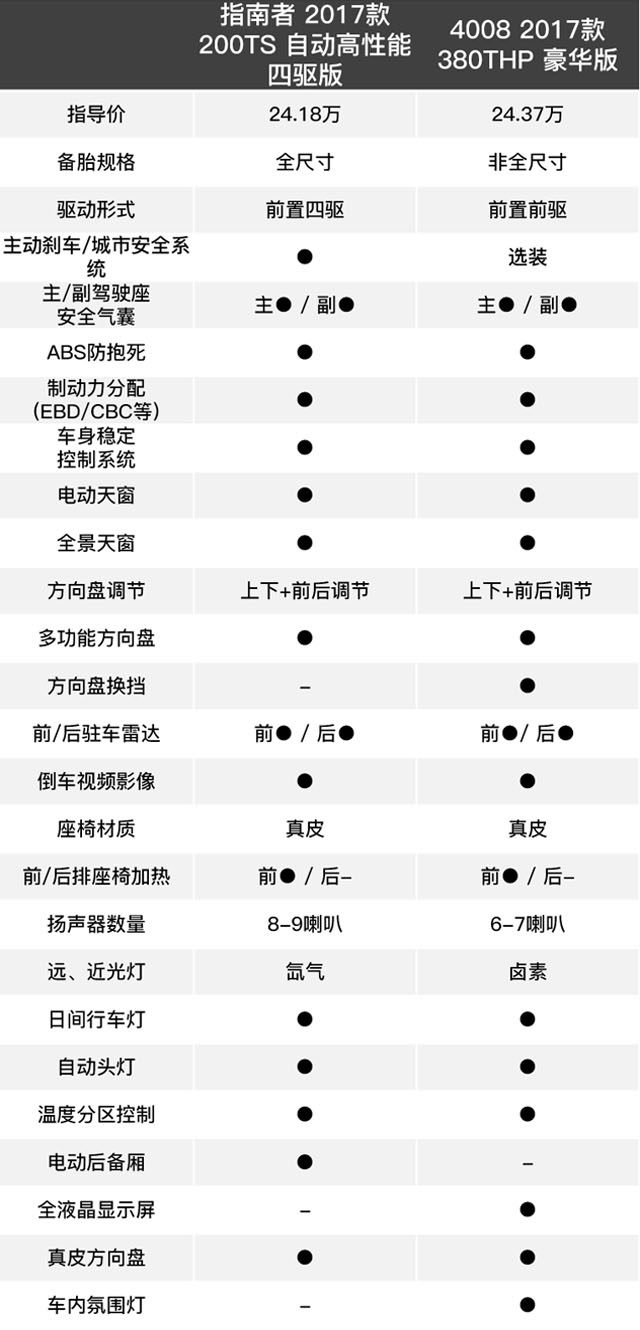在配置对比方面,教授选取了价格相近的两款车型来进行对比。分别是指南者自动高性能四驱型和4008 2017款 380THP 豪华版。指南者在配置上多了电动后备厢,配备了氙气大灯,主动刹车系统,在实用性和安全性上更有优势,而且还多了一个前置四驱,偶尔还可以去野外撒撒野,4008的亮点在于提升车内人员自身的感觉上,方向盘换挡,全液晶显示屏,车内氛围灯。