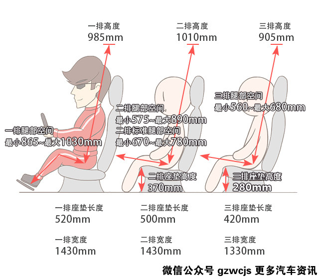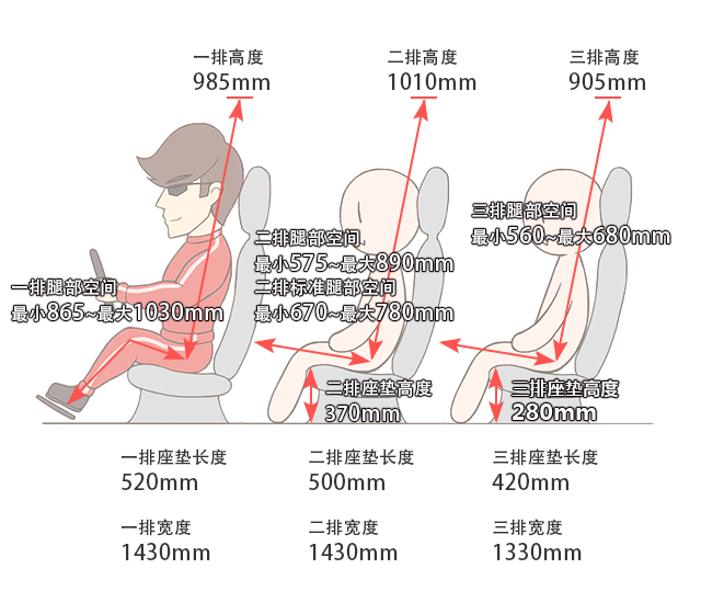 第三排腿部最大一拳,最小时紧贴座椅,头部四指