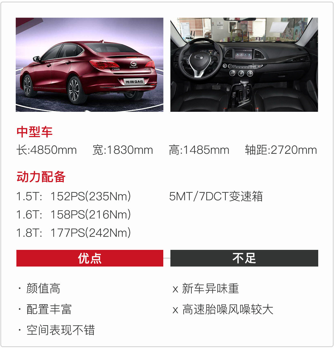 传祺GA6也顺应了潮流换装了1.5T的小排量涡轮增压发动机,动力表现也对得起这个动感的外观,响应很积极,换挡也比较平顺,没有明显的顿挫,行走非常顺畅。传祺GA6轻量化材料的使用也比较上心,底盘应用阿尔法·罗密欧166车型的技术,后副车架和下控制臂都采用铝合金材质,这点在同级车中并不多见,扎实感很不错,不输合资品牌。