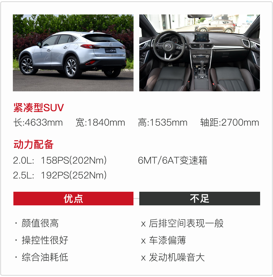 新款的CX-4依然沿用2.0L和2.5L的自吸发动机和6AT变速箱,动力输出线性平顺,没有涡轮的突兀。马自达坚持自吸是有底气的,创驰蓝天的发动机压缩比高达13:1,米勒循环也提高了发动机的效率,轿跑式的低矮车身既提高了高速行驶的稳定性,也降低了风阻,也就是降低了油耗和风噪,即使2.5L车型的百公里油耗也能控制在9L,实属不易。