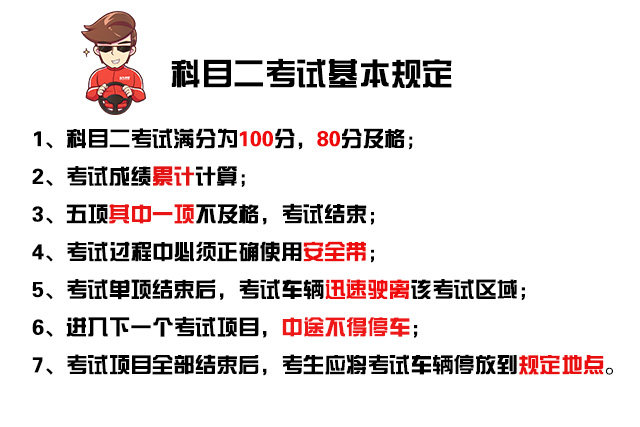 科目二考试总分100分,80分及格,累计分制。当其中一科挂掉,或者被扣分高于20分,直接GAME OVER。而在基础分值里面有多达24项直接不及格的项目,基本教练会详细说明,教授就不再细论。接下来教授会给大家解释新规有什么改变,解除大家对于政策上的疑惑。